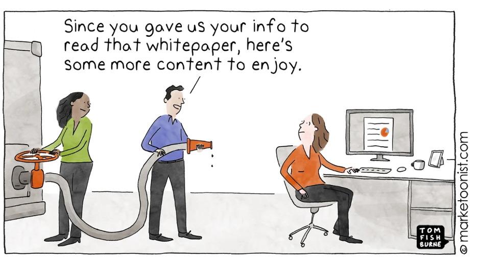 There is a funny truth in this cartoon. A person shares their email to read a whitepaper and suddenly a firehose of content comes flying at them. Articles. Messages. Webinars. Newsletters. More content. More noise. More overwhelm.